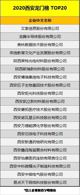 在充沛的产业发展活力与完善的全链条服务体系支撑下,西安企业发展提速。最亮眼的表现是,在今年的“西安龙门榜TOP20”中,有5家企业从“2019西安未来之星TOP100”中晋升上来,分别是龙腾半导体、中科微精、荣信教育、新通药物、中熔电气。同时,艾索信息、易点天下、陕西斯瑞、万德能源等多家上榜企业也受到资本市场的青睐,筹备上市中。未来,龙门榜将形成西安上市企业集群地,激活西安资本市场,助力西安打造上市挂牌的“西安军团”。