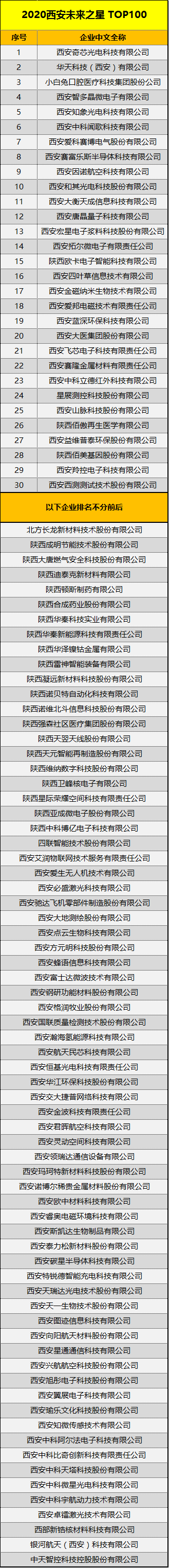 纵观“2020西安未来之星TOP100”榜单,有43家企业蝉联上榜,其中,12家企业排名大幅提升,例如奇芯光电、小白兔口腔、因诺科技、大衡天成、欧卡电子,这5家企业均在近一年内斩获新一轮融资。从行业分布来看,上榜企业涵盖了光电芯片、信息技术、生物技术、人工智能、智能制造、航空航天、新能源、新材料等硬科技八大领域,也与西安市正在构建的“6+5+6+1”现代化产业体系中涉及的产业高度契合。